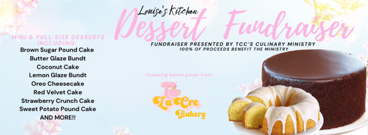Purchase an assortment of cakes and desserts made with love from our Lady Wilson! If you have any questions about our Dessert Fundraiser, please email LADYWILSON@TCCBALTIMORE.ORG